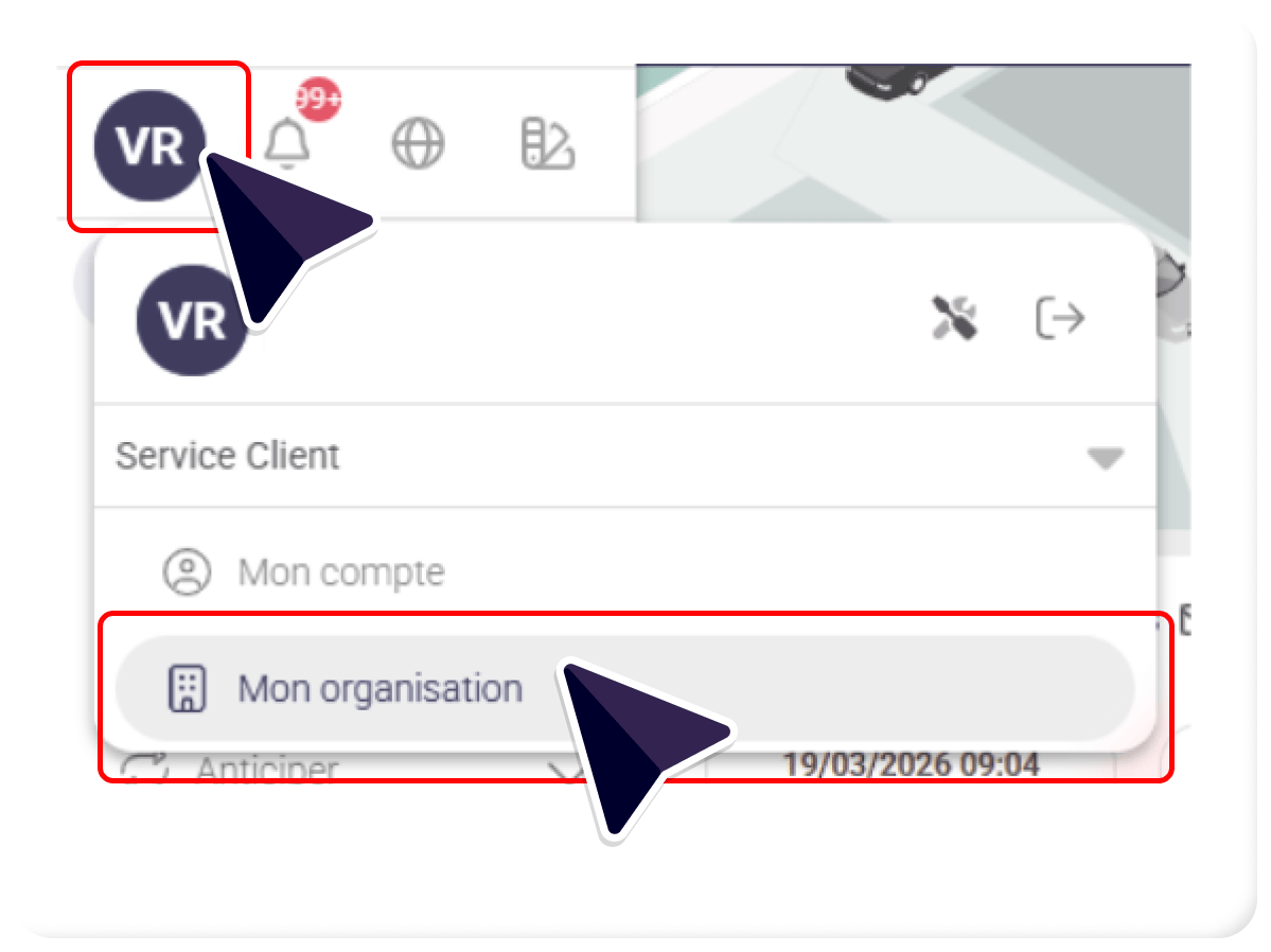 • Cliquez sur vos initiales dans le Menu et accédez à l’onglet « Mon organisation » :