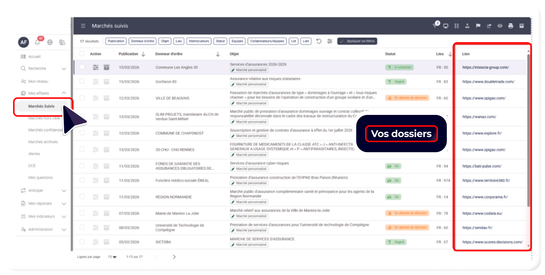 • Ces liens sont accessibles en un clic , depuis le tableau de suivi, comme depuis la fiche marché :