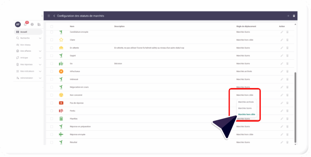 • Pour structurer efficacement le suivi de vos marchés, des règles de déplacement automatique – basées sur les statuts définis – permettent déjà de classer les éléments dans les dossiers suivants :