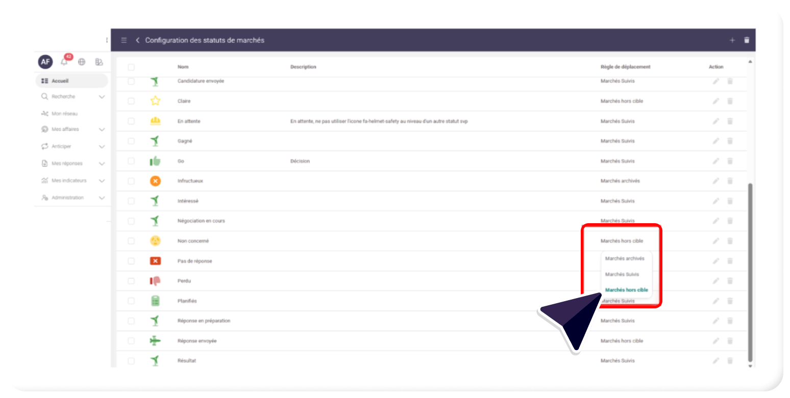 • Il est ensuite possible de paramétrer les règles de déplacement, associées à chaque statut, via la colonne correspondante :