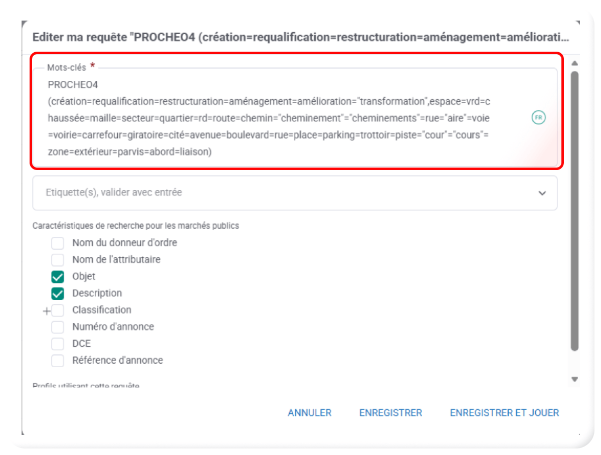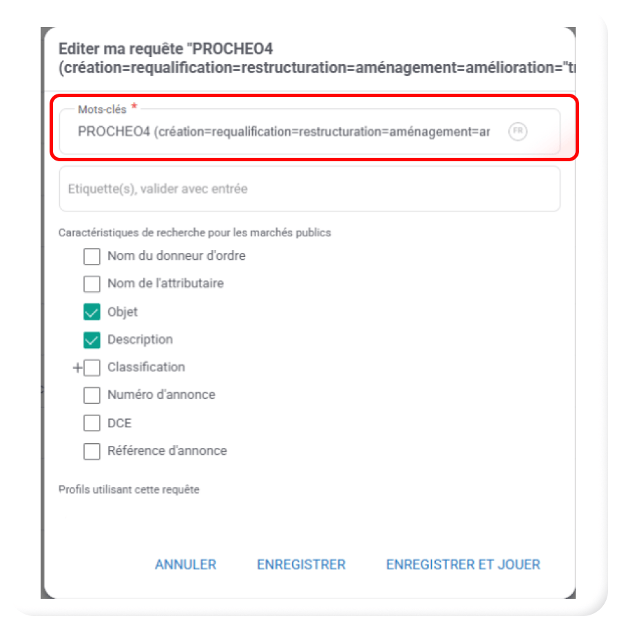 Elle est désormais accessible directement, depuis vos pages de « Marchés suivis », « Marchés archivés » et « Marchés hors cible », via l’onglet « Mots-clés ».