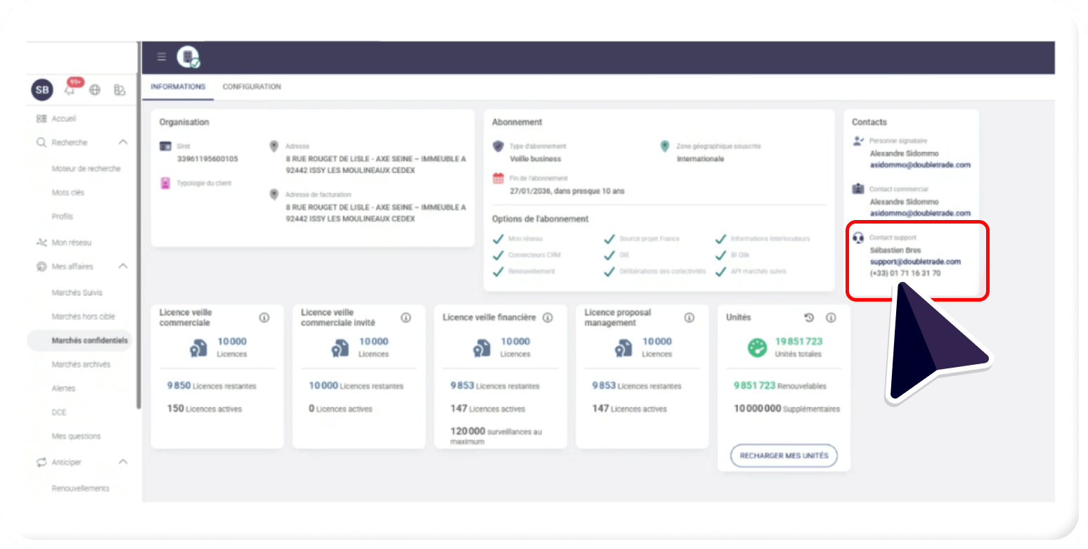 • Dans le bloc « Contacts », vous y trouverez les contacts de l’équipe CSM, en charge de votre suivi.