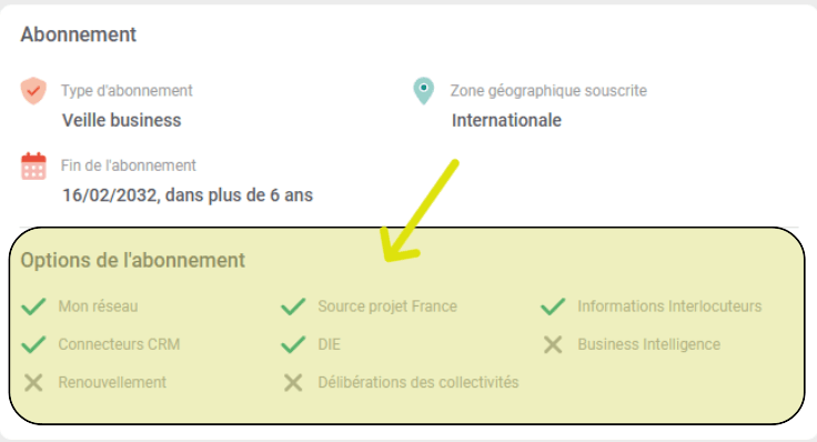 - Les options souscrites, dans le cadre de votre abonnement, sont visibles dans la brique « Abonnement ».