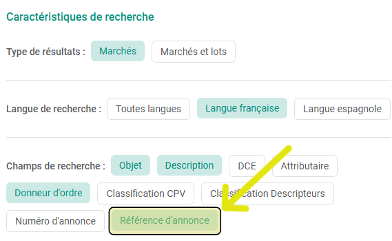 Vous pouvez effectuer des recherches de marchés par la référence d’annonce, communiquée dans l’avis de l’appel d’offres :