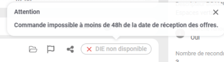 - Amélioration du message d’information, si la commande de DIE est inférieure à 48h :