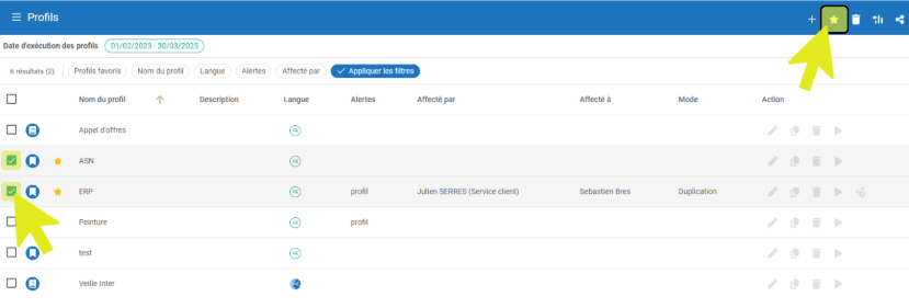 - Pour cela, sélectionnez les profils, puis cliquez sur l’icône étoile « Mettre en favori les profils sélectionnés », afin que l’icône