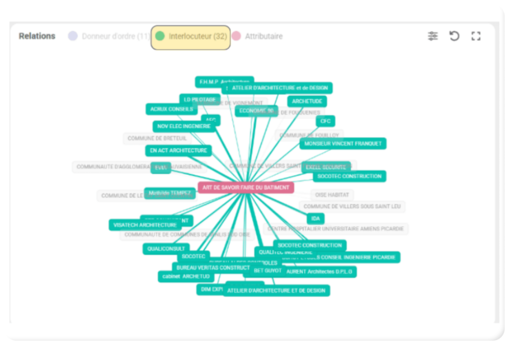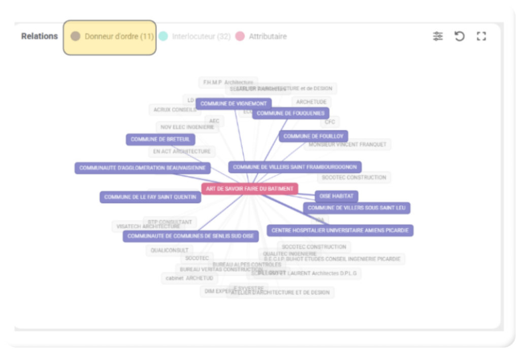 Lorsque vous ouvrez la fiche d’un établissement (Exemple : donneur d’ordre ), vous accédez à la liste de l’ensemble des relations et de l’ensemble des marchés de ce donneur d’ordre. Vous pouvez maintenant affiner ces relations et la liste de marchés, en sélectionnant l’un de vos profils :