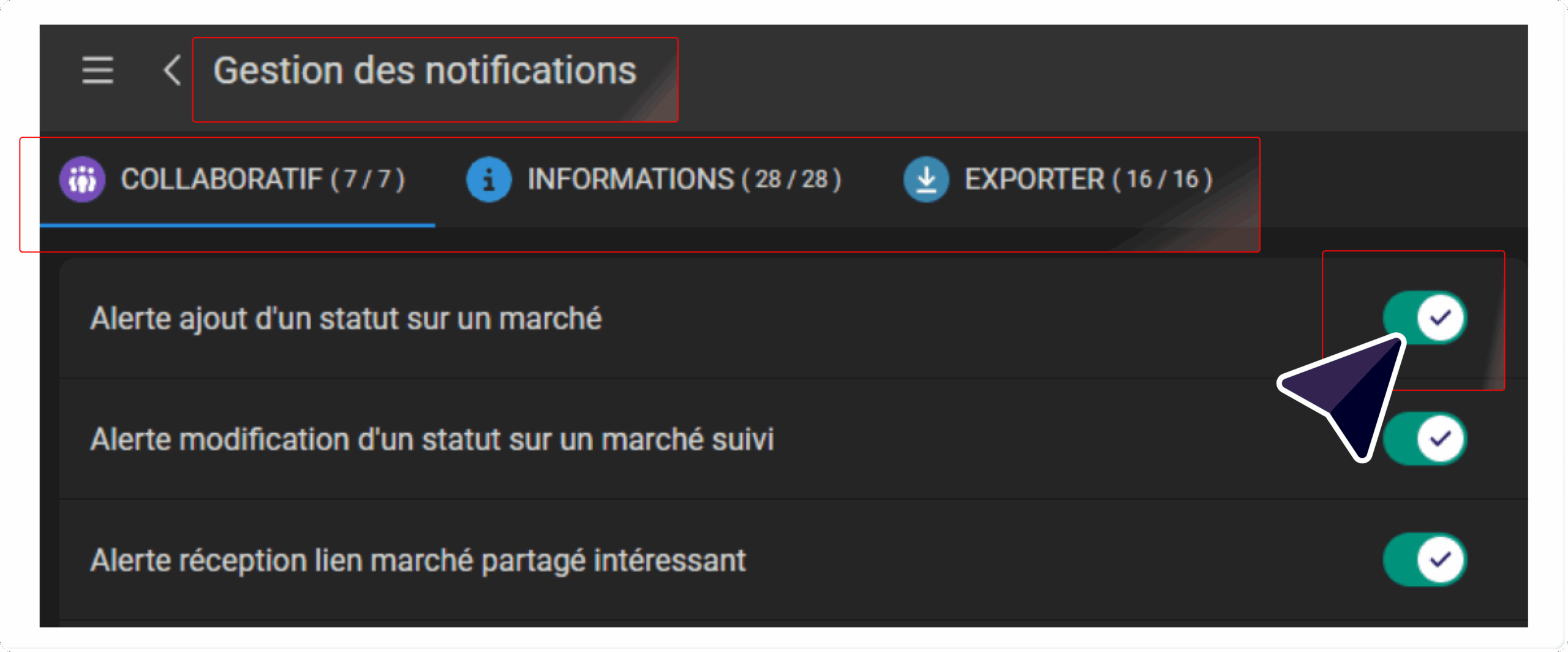 notifications, pour les modifications des marchés suivis par l’équipe. - Cette fonctionnalité est amenée à évoluer, pour améliorer la gestion des notifications en contexte collaboratif.