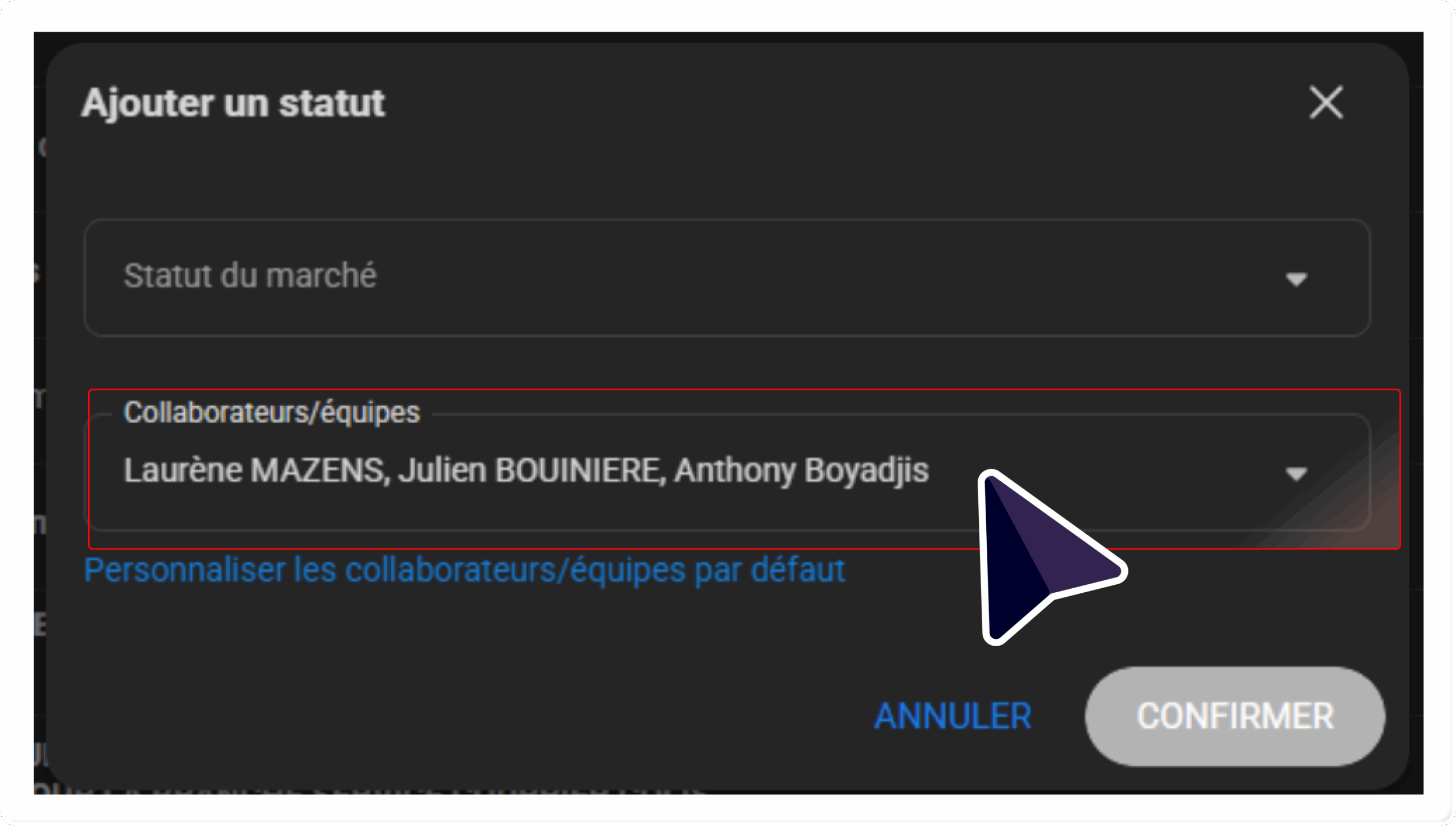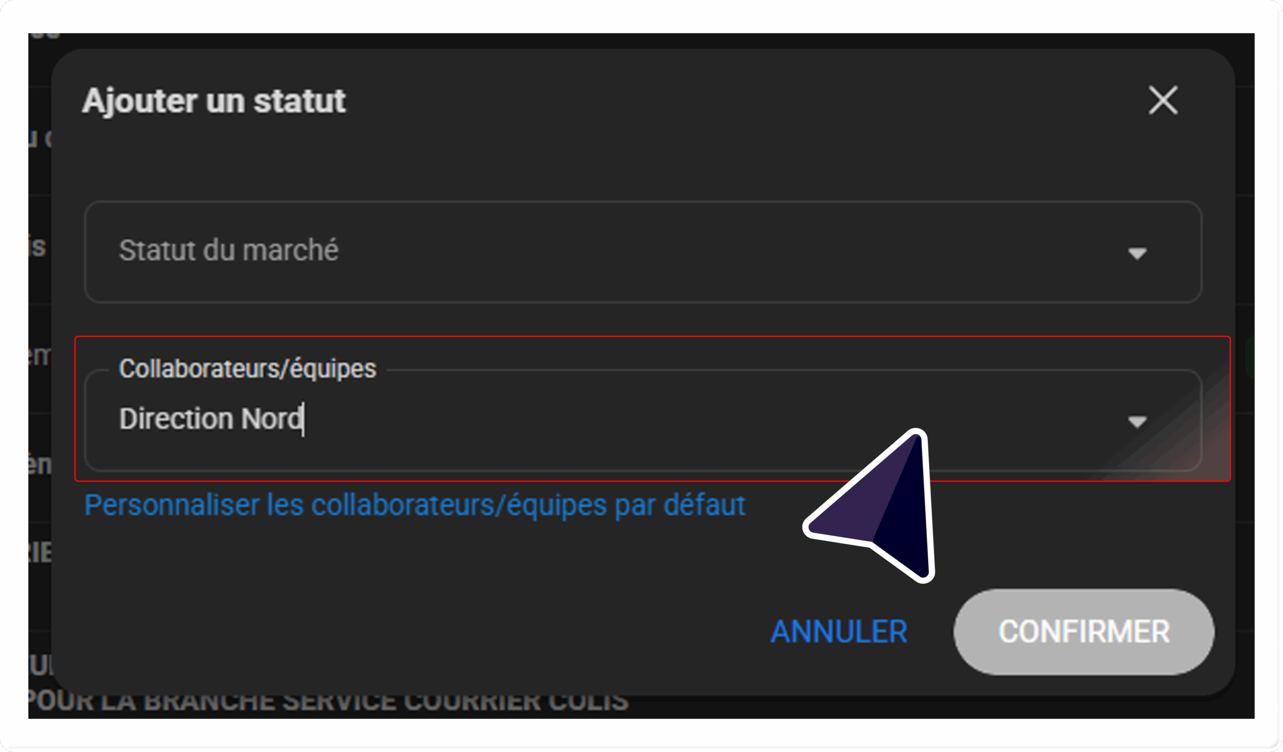 ⚠️ Si les collaborateurs et/ou équipes sélectionnés sont strictement identiques à ceux d’un statut déjà existant sur le même marché, alors le système met à jour le statut existant correspondant (au lieu d'en créer un nouveau).