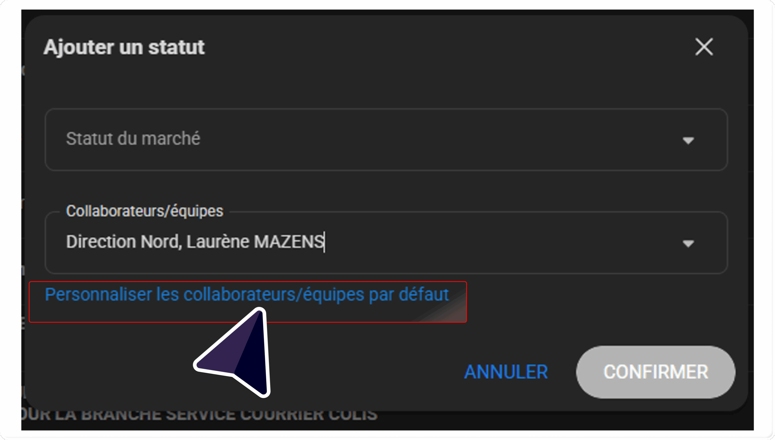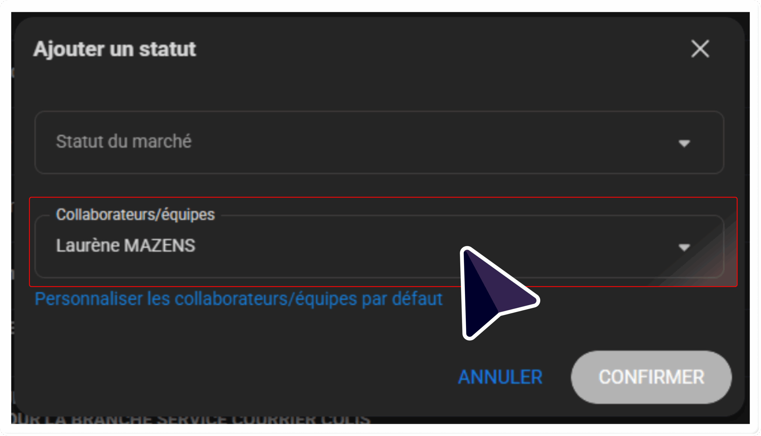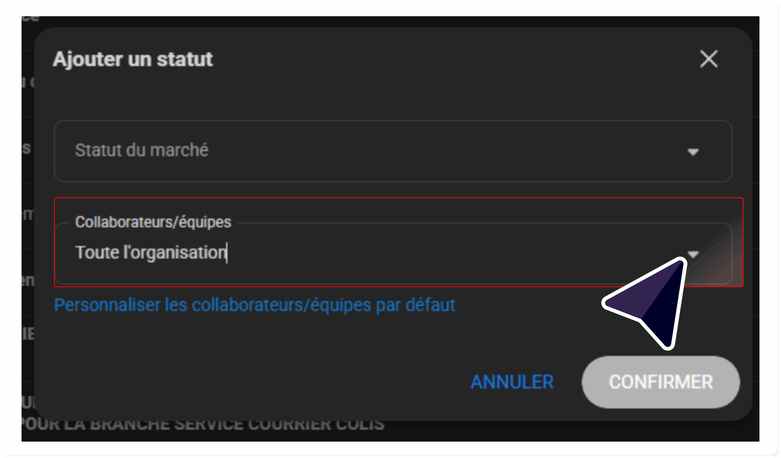 - Via la pop-up « Ajouter un statut », en cliquant sur « Personnaliser les collaborateurs/équipes par défaut » :