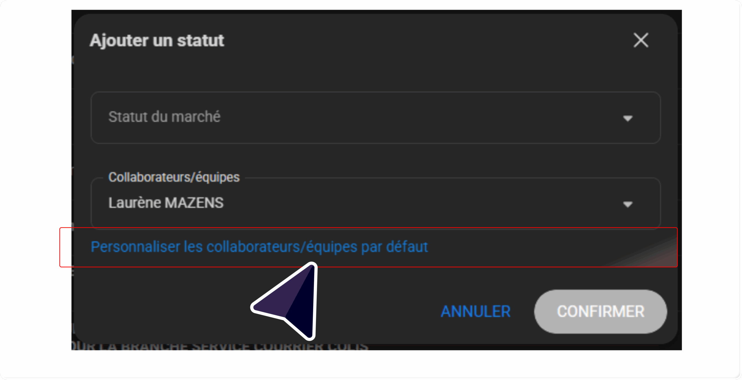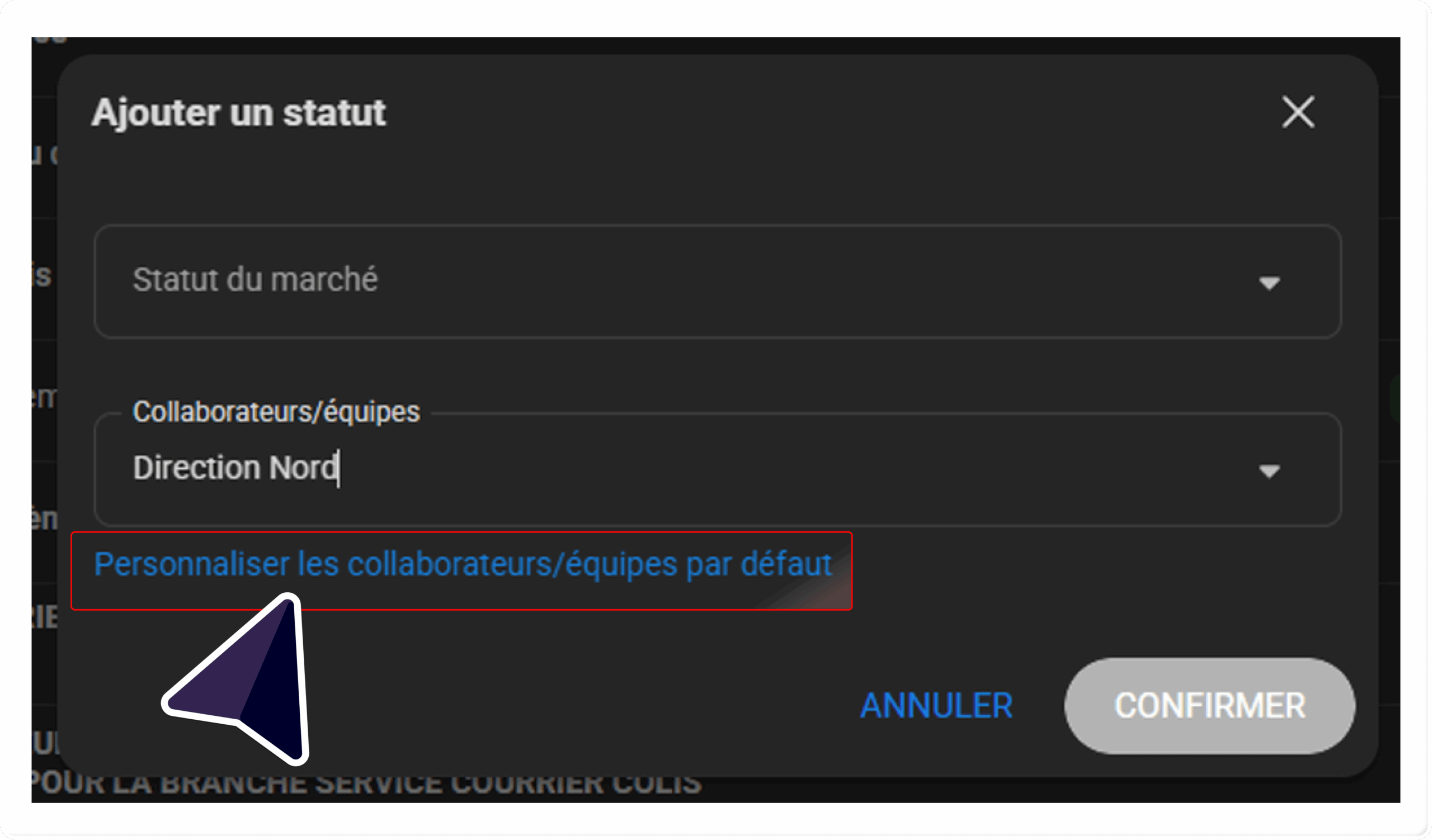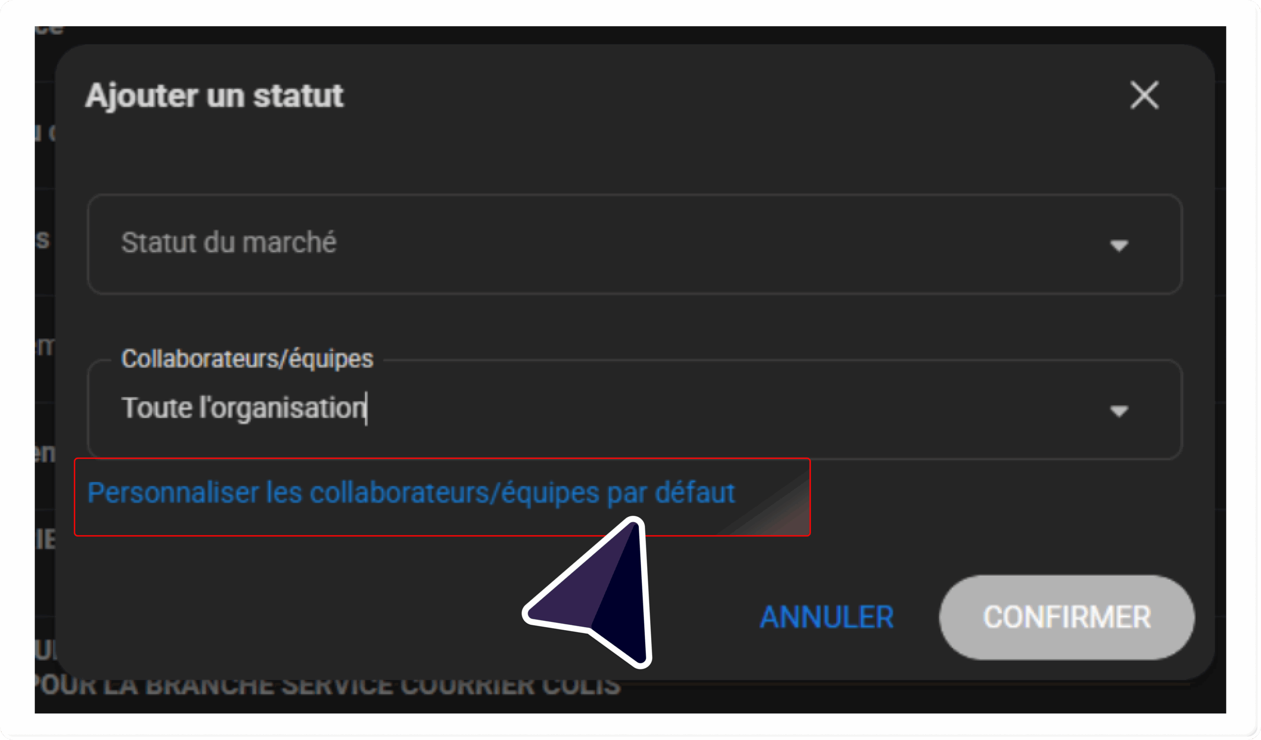 - Via la pop-up « Ajouter un statut », en cliquant sur « Personnaliser les collaborateurs/équipes par défaut » :