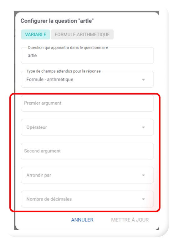 - La réponse à cette question sera le résultat d’une opération arithmétique, dont l’un, ou l’ensemble des arguments, sera une réponse apportée à une variable de type « Nombre ».