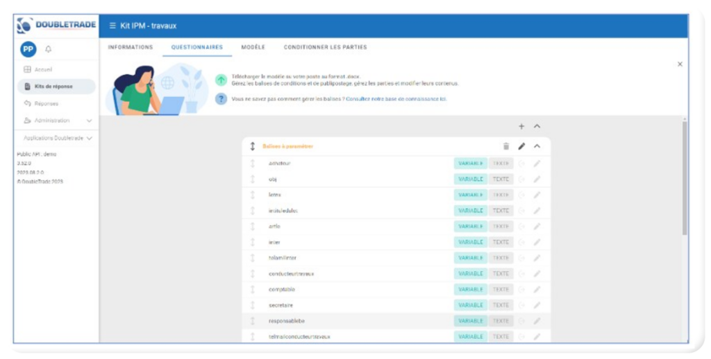 - Sur cette page, vous pouvez paramétrer le questionnaire de réponse pour un kit.