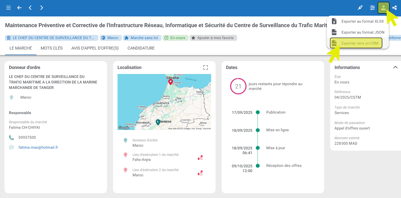 - Tout d’abord, accédez à une page marché/ projet et cliquez dans la barre d’outils, en haut à droite, sur le bouton « Exporter », puis choisissez : « Exporter vers un CRM » :