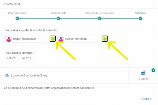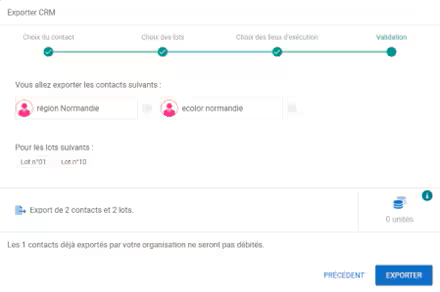 - Avant de valider l’export, vous pouvez visualiser le résumé des informations, qui seront exportées dans votre CRM, ainsi que les unités, qui seront débitées de votre compteur :