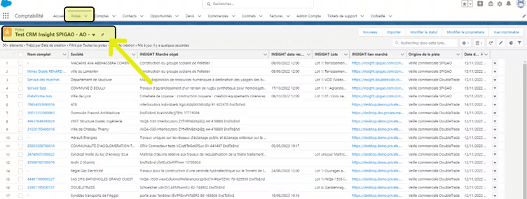 - En vous rendant dans l’onglet « Piste/Prospect » de votre CRM, vous êtes ainsi en mesure de retrouver l’ensemble des données exportées :