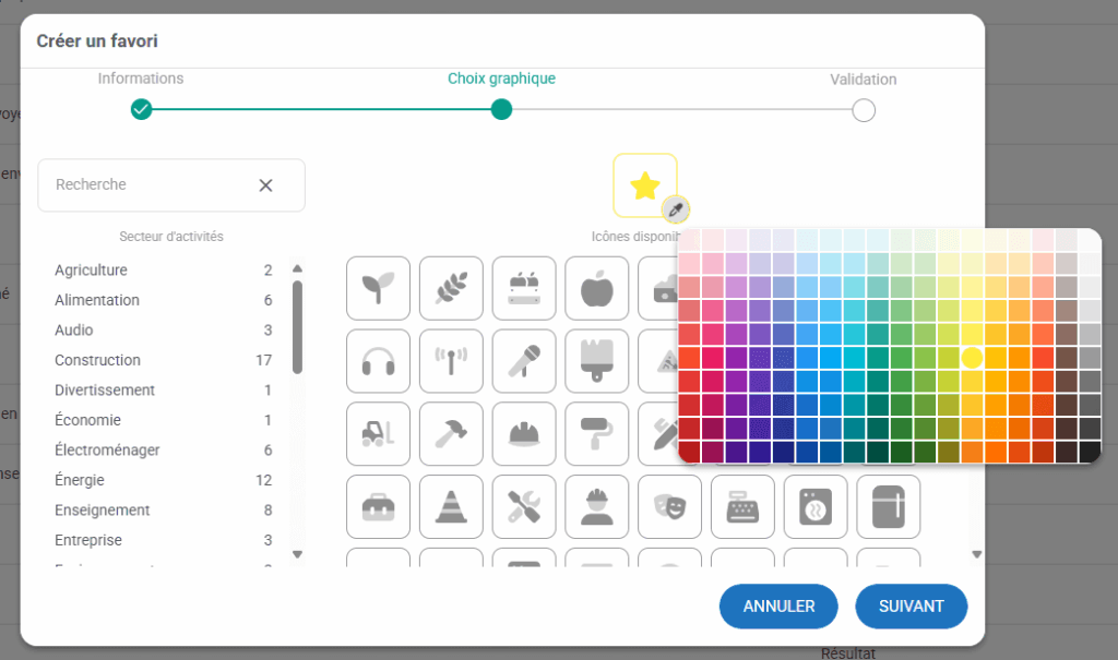 • Les favoris (ou statuts) évoluent, grâce à l’ajout possible de label spécifique, ainsi qu’aux choix d’icônes et de couleurs explicites. Choisissez l’icône rattaché à votre favori (statut), ainsi que le code couleur souhaité :