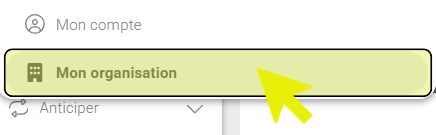 • Si vous êtes bien administrateur de la plateforme Insight, commencez par cliquer sur vos initiales, en haut à gauche de la plateforme, puis sur l’onglet « Mon organisation » :