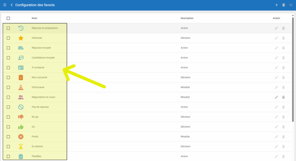 • Les favoris (ou statuts), actuellement paramétrés, apparaissent sur la page de configuration :