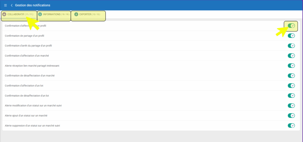 • Sur la page « Gestion des notifications », vous pourrez ainsi activer / désactiver les notifications de type «  Collaboratif » ou « Informations » que vous jugez nécessaires :