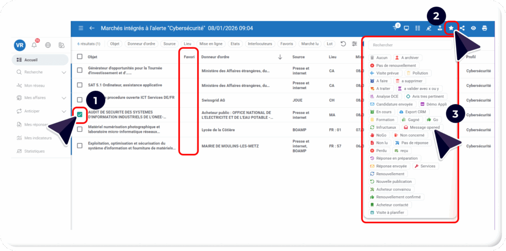 - Lorsque vous êtes sur une vue de résultats de recherche, par exemple, via l’accès à vos « Alertes » à partir de l’Accueil, vous avez la possibilité de sélectionner des marchés pour leur ajouter un « Favori » :