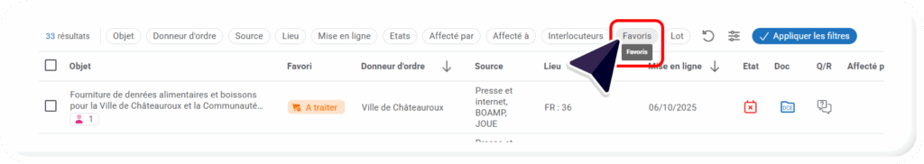 - Différents filtres sont également à votre disposition, pour classer vos marchés, notamment, un filtre pour classer vos marchés par favoris :