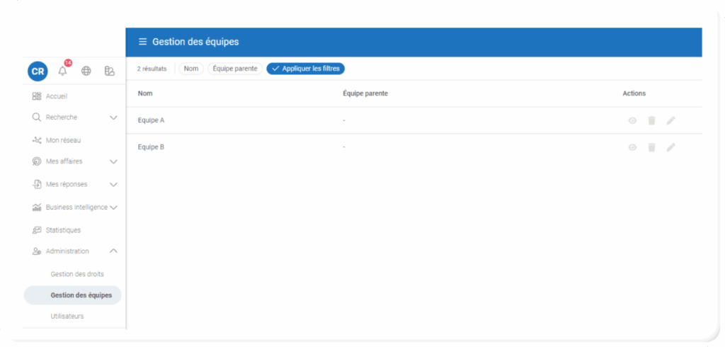 L’administrateur de votre plateforme Insight (par défaut, le signataire du contrat) peut créer les équipes et ajouter les personnes dans chaque équipe, depuis le Menu Administration > Gestion des équipes.