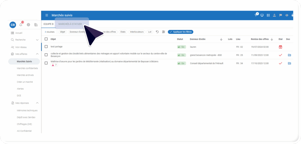 - Le mode collaboratif vous permet de partager les marchés aux autres personnes de votre organisation/équipe, afin d’avoir un suivi commun des marchés.