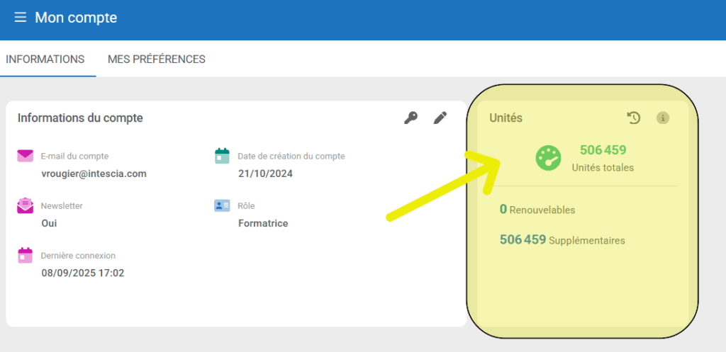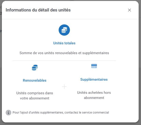 - Le bloc « Unités » présente votre solde des unités totales (ou crédits), vous permettant notamment de télécharger vos DCE et/ ou d’exporter vos documents, depuis la plateforme Insight :