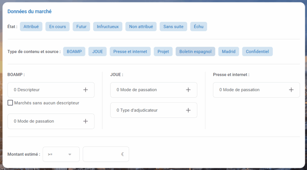 - Vous pouvez affiner votre recherche, en fonction du montant estimé du marché :