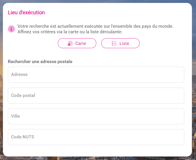 - Vous pouvez affinez votre recherche, quant au lieu d’exécution, via une carte, ou une liste déroulante, à l’aide des critères suivants :