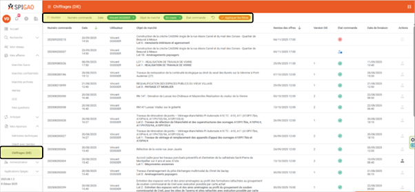 • La page « Chiffrage DIE », accessible à partir du menu principal de la plateforme Insight, présente l’ensemble des commandes passées, annulées ou en cours, avec des tris possibles par dates (de commande ou de remise) et des filtres ajustables :