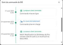 • Après la commande d’un DIE, vous avez accès à plusieurs informations, permettant de suivre son évolution.