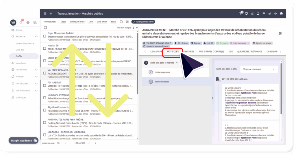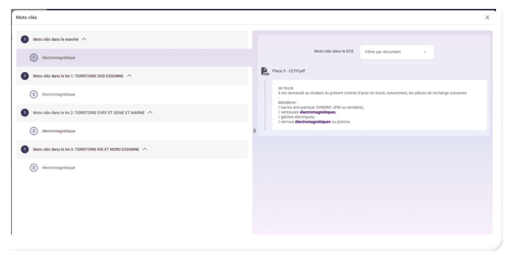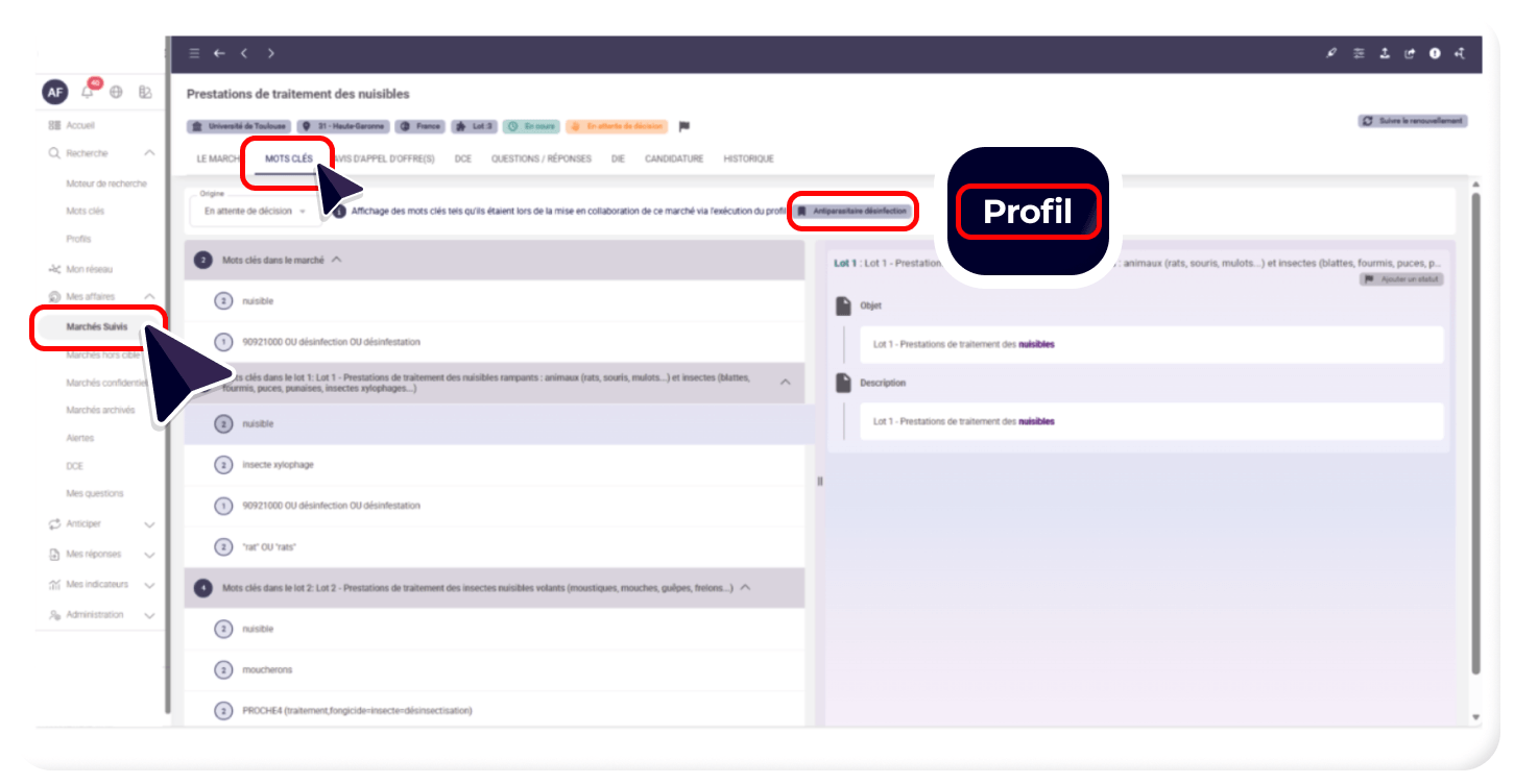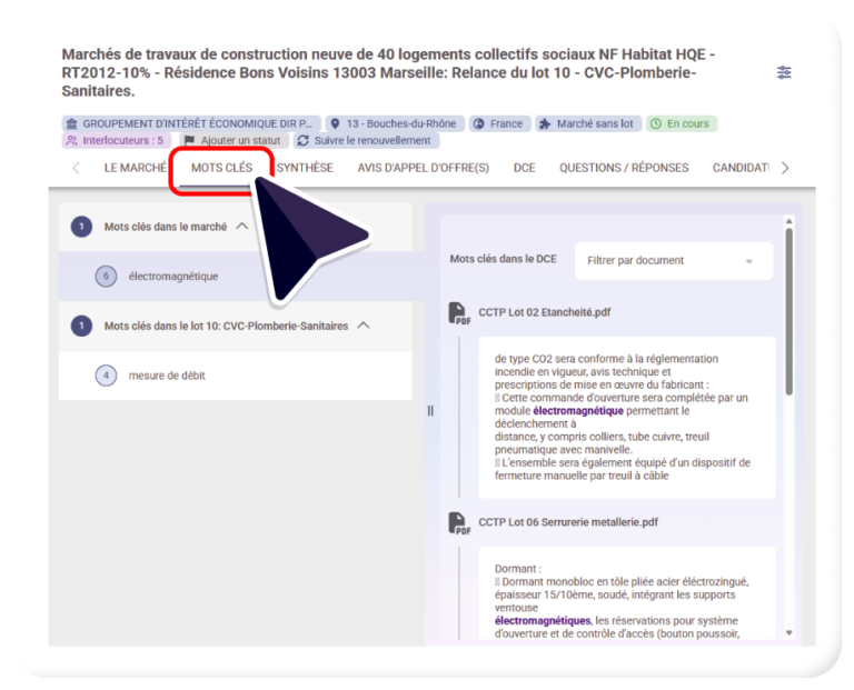 - Autrement dit, vous pouvez ainsi identifier quels sont les mots clés, ayant permis la livraison de l’appel d’offres et s’ils ont été détectés dans l’annonce, dans les lots et/ou le DCE.