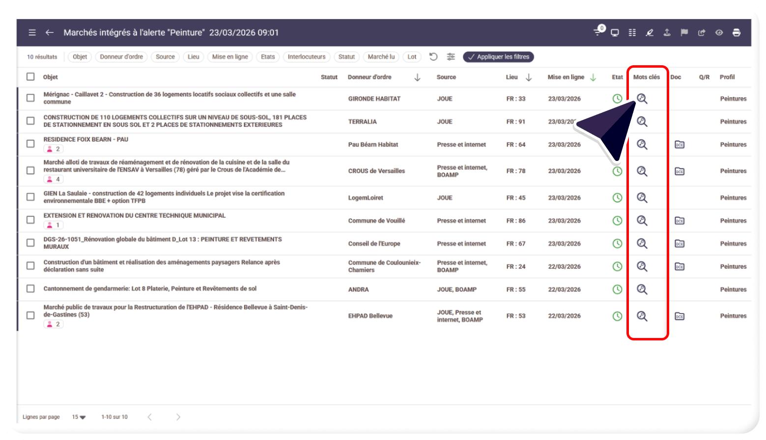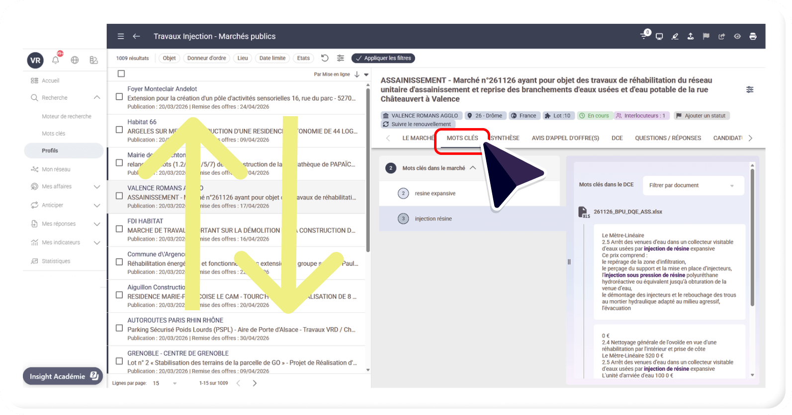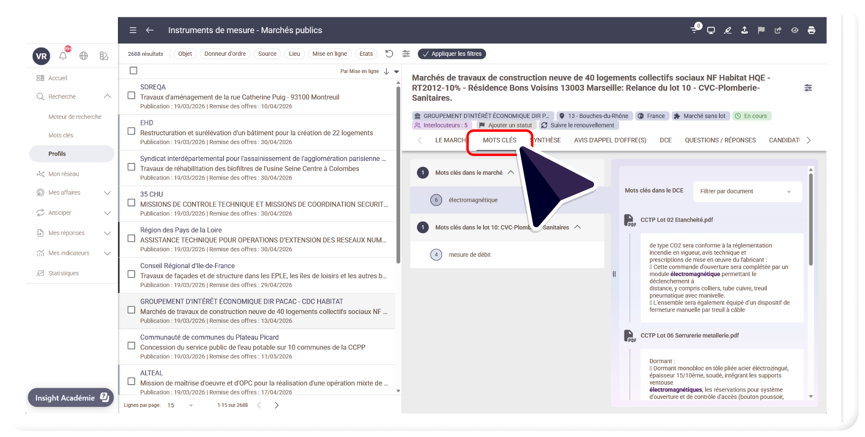 - Autrement dit, vous pouvez ainsi identifier quels sont les mots clés, ayant permis la livraison de l’appel d’offres et s’ils ont été détectés dans l’annonce, dans les lots et/ou le DCE.