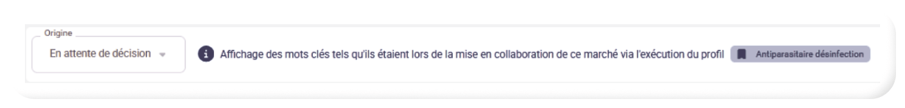 - Vous retrouverez les mots-clés, ainsi que le profil, à l’origine de la détection du marché, dans un onglet « Mots-clés » :