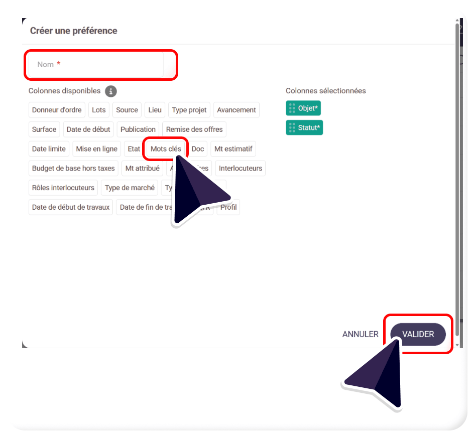 Pour ajouter la colonne « Mots-clés » dans la section « Préférences de colonnes » :