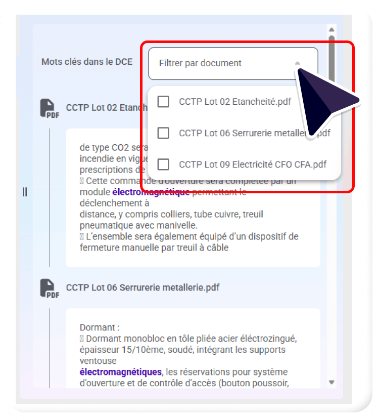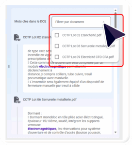 - L’une des particularités de la section « mots-clés dans le DCE » est qu’il vous sera également possible de filtrer les résultats par type de document :