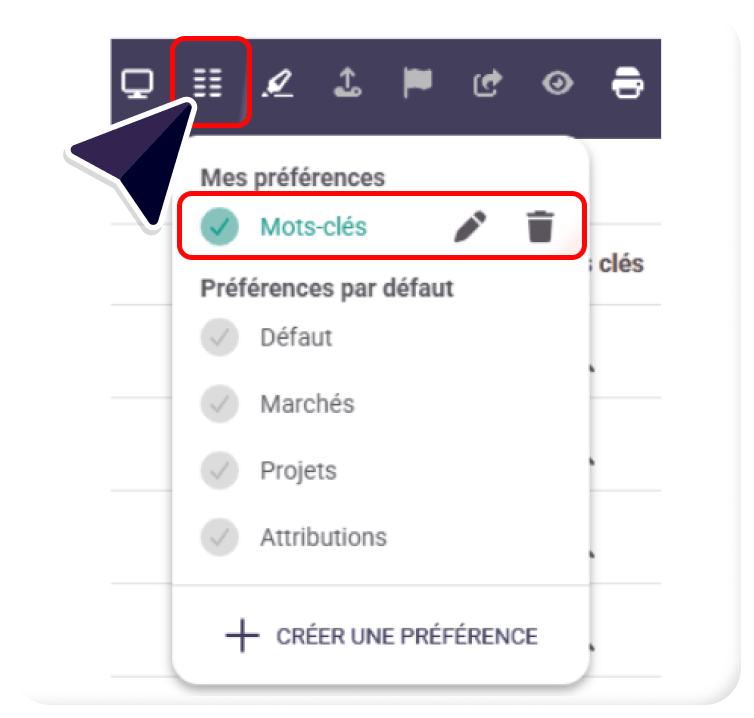 - Il vous sera nécessaire d’ajouter une préférence de colonne « Mots-clés » à votre sélection de colonnes dans la section « Préférences de colonnes » :