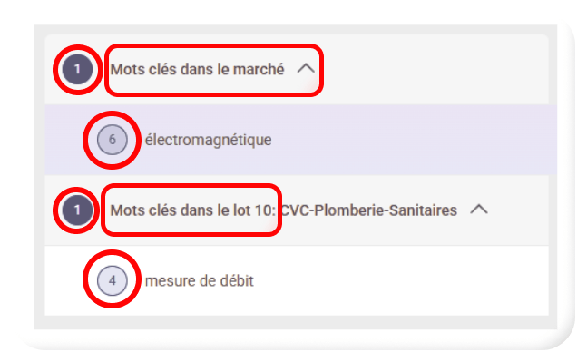 - Le chiffre indiqué devant chaque ”chapitre” (Marché / Lots / DCE) de l’appel d’offres représente le nombre de mots clés détectés à ce niveau.